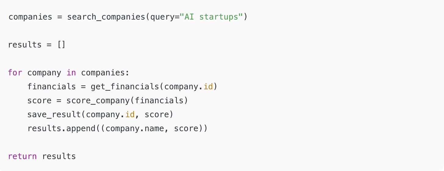 For example, imagine an agent is tasked to synthesize a bunch of financial records, and has access to a company search tool & a fetch financials for company tool. What you want to do is: